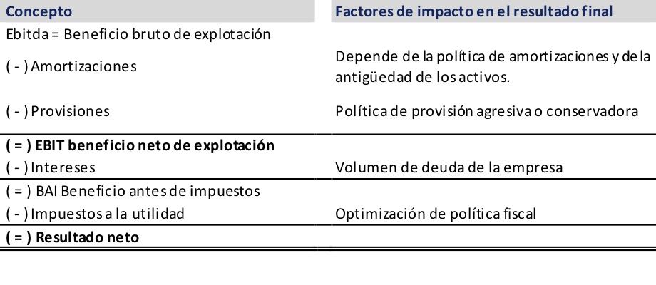 El paso del EBITDA al resultado neto está influido por todos estos elementos que pueden cambiar sustancialmente el resultado final según el criterio contable que se aplique, veamos con más detalle en la siguiente tabla: