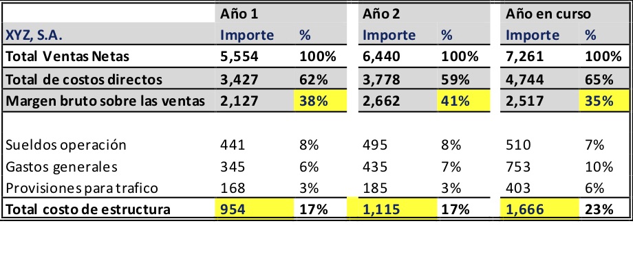 En este cuadro podemos apreciar que, de cada peso generado de margen bruto de las ventas, 45 centavos se los lleva la estructura en el año 1, en tanto que en el año en curso esta cifra se ha deteriorado y de cada peso generado 66 centavos se dedican a la estructura operativa de la empresa.