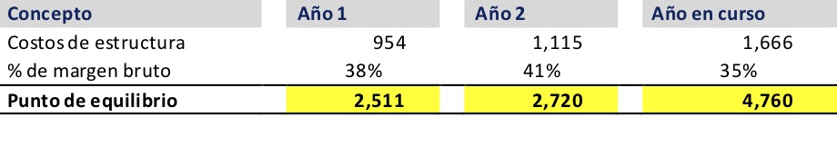 Con estos datos podemos calcular el punto de equilibrio de nuestro negocio por cada uno de los años, tal y como lo muestra la siguiente tabla: