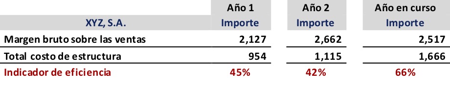 El indicador de eficiencia de la estructura se calcula dividiendo los costos de estructura entre el margen bruto sobre las ventas expresado en importes, no en porcentaje, como sigue: